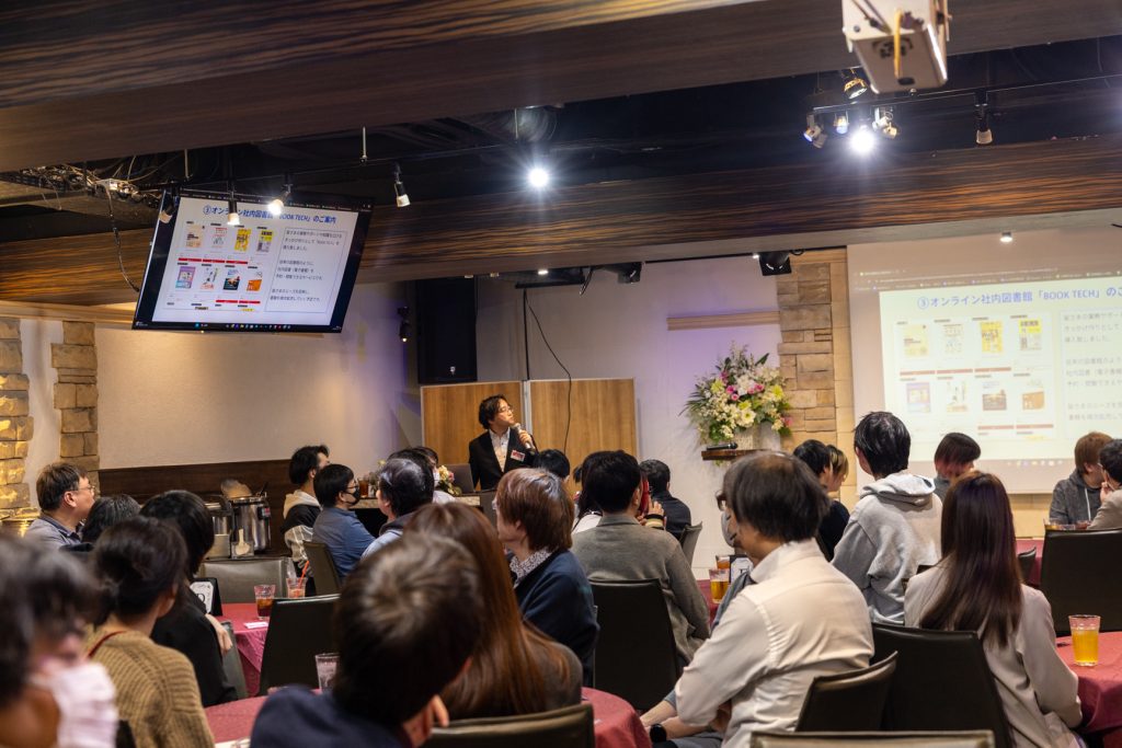 開会式では、売上や社員数の増加といったエクストリームのこの一年の成長に加え、社員の学びと成長をサポートするための「インプット支援制度」や「カムバック制度」「お友達紹介制度」「オンライン社内図書館book tech」など、充実した制度が紹介されました。